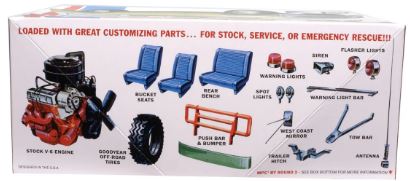 This kit is just brimming with great customizing parts that let you build it in one of three ways: Stock, Service, or Emergency Rescue. Features include a stock V-6 engine, bucket seats, rear bench, west coast mirrors, tow bar, trailer hitch, push bar & bumper, spotlights, warning lights, flasher lights, siren, warning light bar, antenna, Goodyear off-road tires, and so much more. With a large set of ALL-NEW water-slide decals, all packaged in MPC’s retro deluxe style packaging.