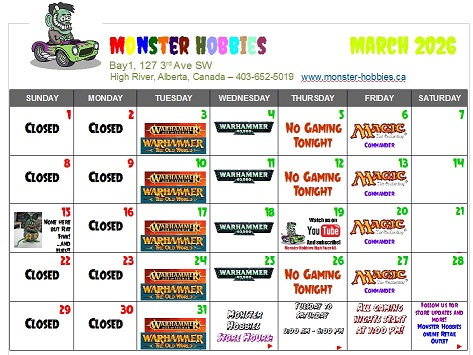 WEEKLY GAME NIGHTS AT MONSTER HOBBIES IN MARCH! All Events Run 7:00 PM – 9:00 PM TUESDAYS – WARHAMMER FANTASY Battle it out in: Warhammer: The Old World Warhammer Age of Sigmar Bring your army and play — or come paint and hobby in a relaxed, welcoming atmos ... More! |